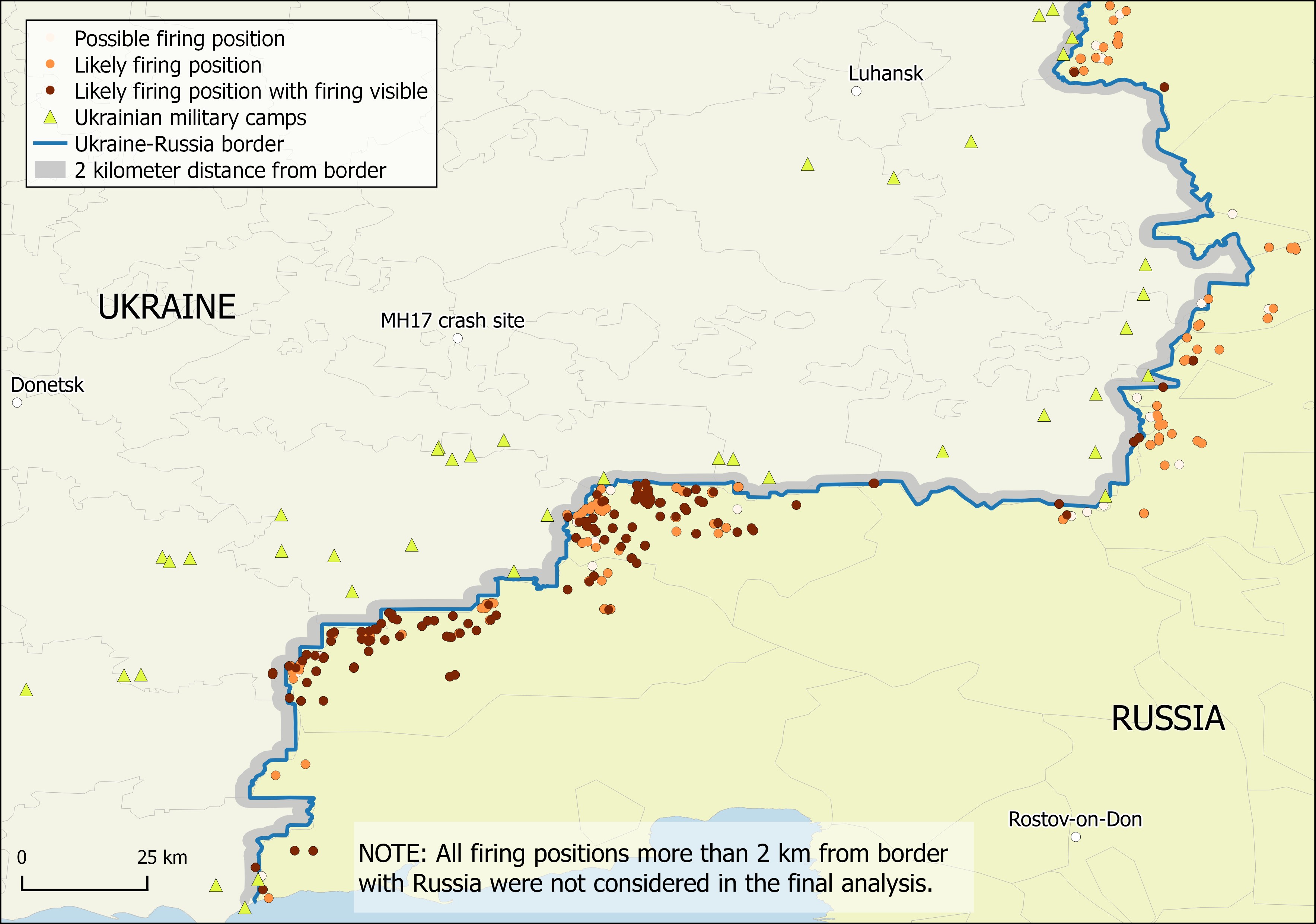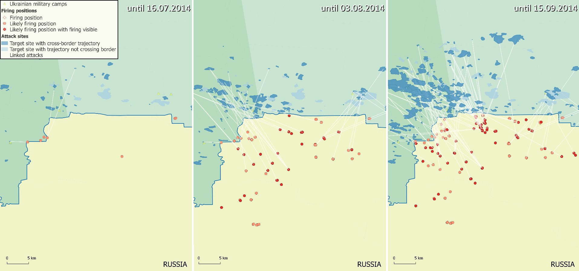 Building on the preceding reports, the intention of this report is to document the full scale of Russian artillery attacks against Ukrainian forces in summer 2014. The entire border region in the conflict area was searched for potential firing positions or artillery target sites. In total, hundreds of relevant locations were identified. The main findings can be summarized as follows: