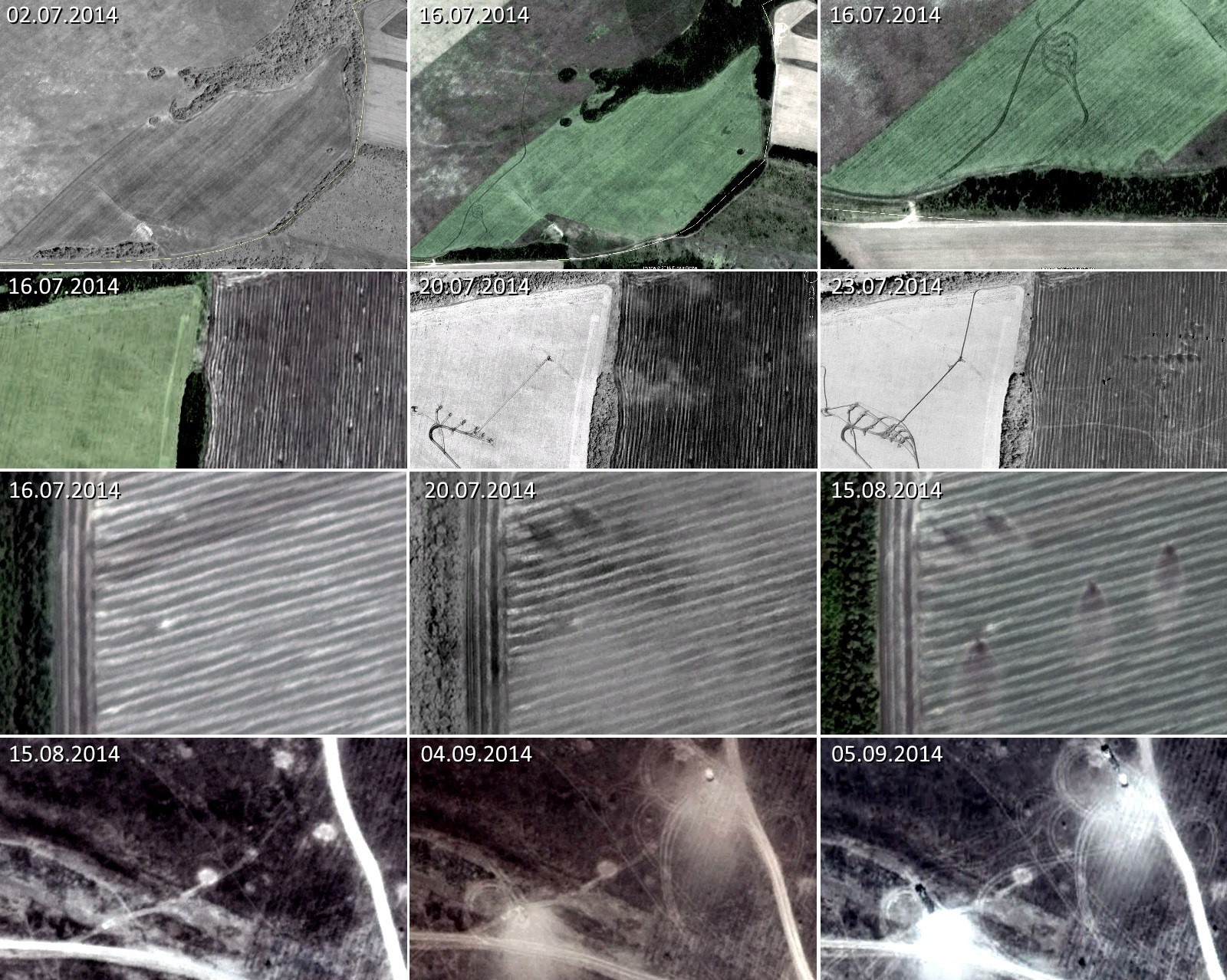 The third row shows an area which was used twice as a firing position for MLRS attacks against Ukraine. The first attack, leaving two distinct blast marks, occurred between 16.07.2014 and 20.07.2014. The blast marks indicate outgoing fire in north-westerly direction. On 15.08.2014, three new blast marks are visible in the same area. The attack firing towards the north must have been occurred between 02.08.2014 and 15.08.2014.