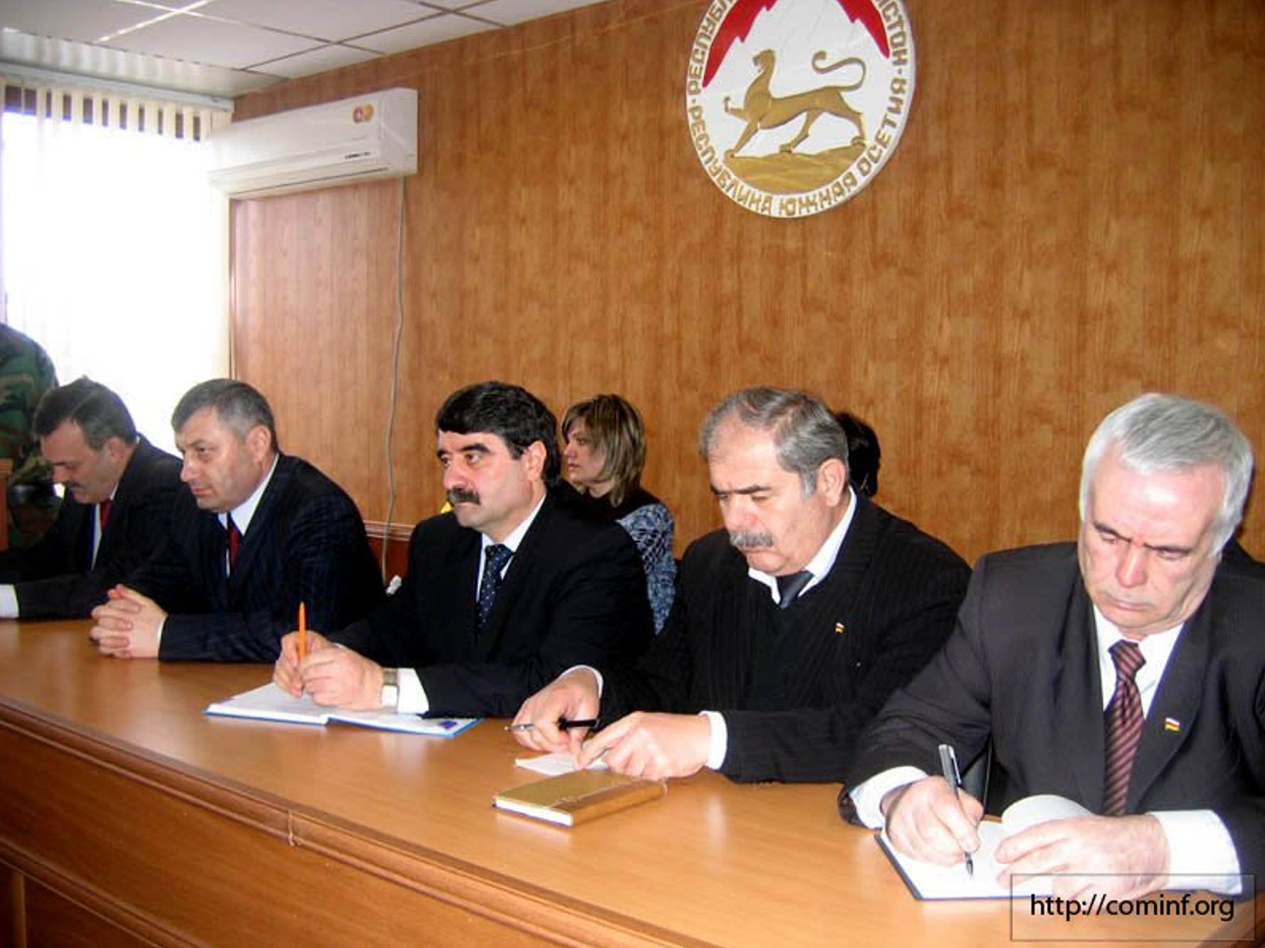 [... photo ...] -- South Ossetian government officials, including President Eduard Kokoity (2nd from left).On 23 February 2010, a meeting was held in Tskhinvali, the capital of South Ossetia, where several South Ossetian and Russian officers and soldiers were presented awards by the president. A high-order medal, the ‘Order of Watsamonga’, was awarded that day to two people: Taymuraz Mamsurov, head of the Republic of North Ossetia-Alania, and ex-Defense Minister Andrey Laptev. Photographs (archive) show Mamsurov with the order, as well as two other men, who apparently were awarded the same order at an earlier time. These men are Valery Valiev, who succeeded Mindzayev as Minister of Internal Affairs, and Ibrahim Gasseev, then deputy minister of defense, and since 2016 the Minister of Defense. However, despite being one of only two people receiving this award at the ceremony, Laptev is nowhere to be seen in these photographs.