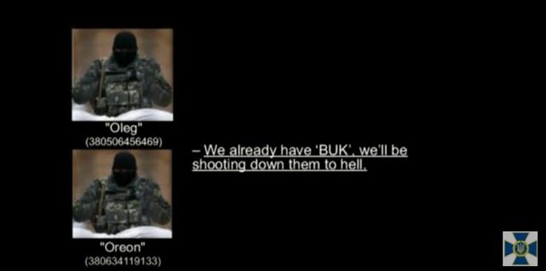 One day after the downing of MH17 over eastern Ukraine, on 18 July 2014, the Security Service of Ukraine (SBU) published intercepted telephone conversations allegedly related to the criminal act that led to the deaths of all 298 people on board the plane. One conversation dated 14 July 2014 - three days before the downing - was reported to be between Oleg Bugrov, former Deputy Minister of Defense of the LNR, and a man referred to as ‘Andrey Ivanovich’ with the call sign ‘Oreon’, who, according to SBU’s description to the call, was a Russian citizen and officer of the GRU. In this conversation, ‘Oreon’ is heard boasting that “they” have come into possession of a ‘Buk’ and will start shooting down [Ukrainian military] planes with it. According to a 18 July 2014 statement by the SBU, the Buk-M1 missile launcher that downed MH17 was transported from Russia to Ukraine during the night of 16 to 17 July 2014. It is unclear from the call whether ‘Oreon’ was referring to a different Buk that had been procured in Eastern Ukraine on or before 14 July 2014, or about the Buk that was expected to arrive later that week.