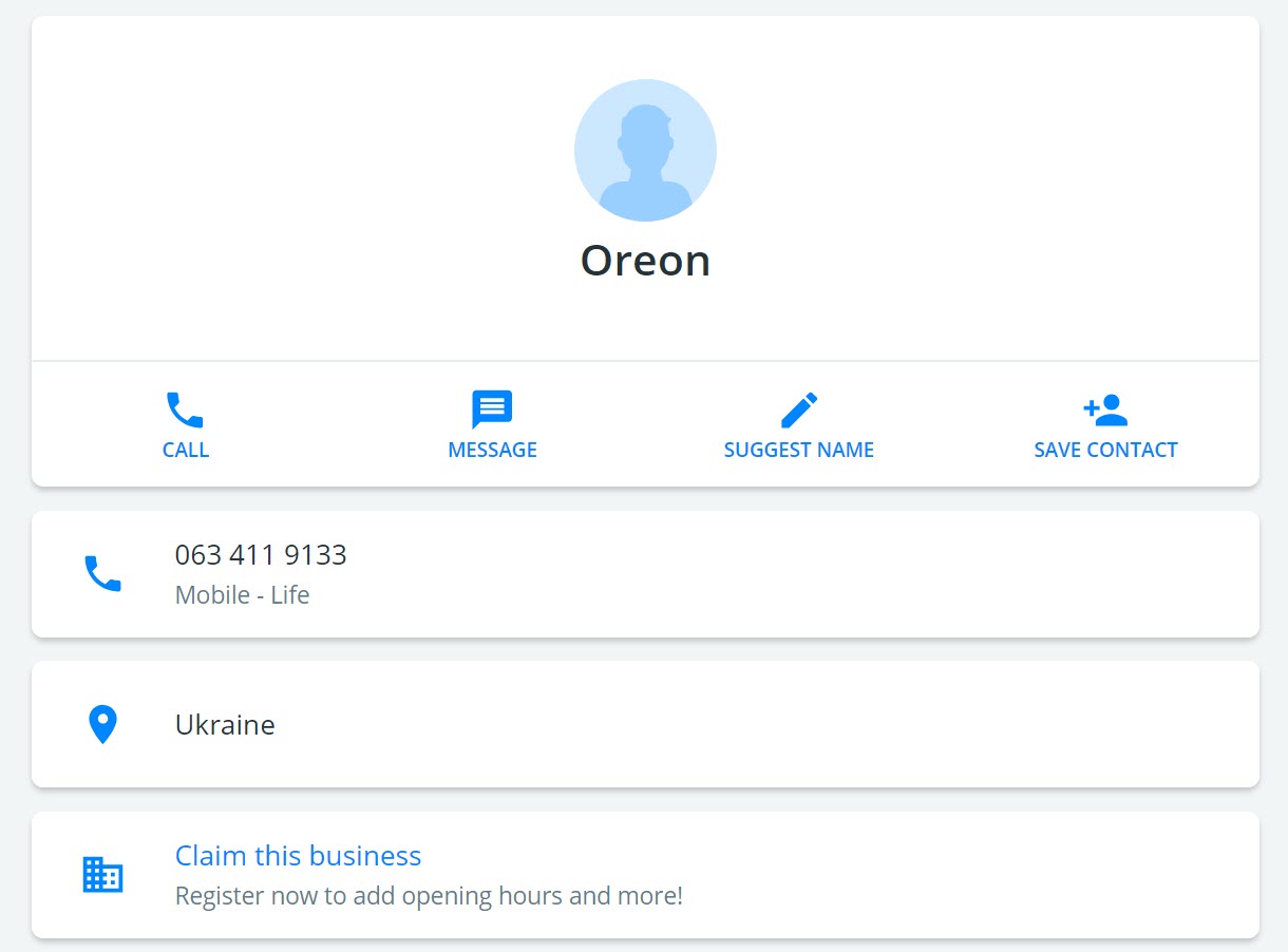 [... image ...] -- Screenshot from TrueCallerAs seen in this screenshot from TrueCaller, the owner of the telephone number is described as ‘Oreon’, identical to the spelling of the call sign initially announced by SBU, and slightly different than the ‘Orion’ spelling used in the subsequent JIT releases. The difference might be explained by the nature of phone-sharing apps which aggregate all contact lists of their users. Therefore, the owner of a telephone number may appear with various spellings - or even different names - reflecting the way this number is described in the contact list of the user who first introduced it into the phone sharing app.