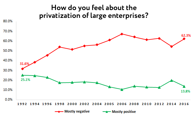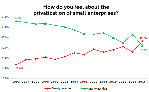 The same is true for privatization. State property reform, or privatization, began once the country became independent. Today it is still far from its completion, though almost every government put it on the priority list. One of the reasons is acute lack of public support. Except for 2014, small privatization kept losing support.