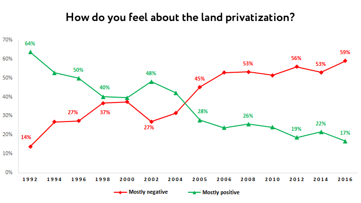 In 1992, only 14% of Ukrainians opposed creation of the land market. A decisive 63.5% supported it. In 2016, a totally opposite situation took place: a miserable 16.7% in favor while decisive 59% against.