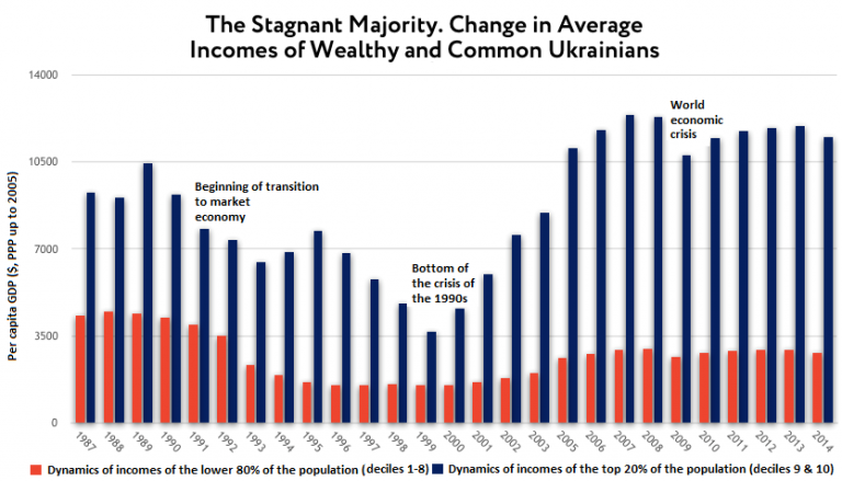 Inequality. Bulgaria, Russia and Ukraine experienced the most dramatic increases in income inequality among post-Soviet countries during the transition. Sharp losses by 80% of the population were accompanied by a significant gain among the richest 20% (Milanovic 1998). While incomes of top 20% have restored to pre-crisis levels, incomes of the lower 80% kept stagnating throughout the entire post-Soviet period.