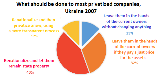 Perceived illegitimacy. A research involved 28 transition economies including all post-Soviet. More than 50% of the population of each of those countries (more than 80% of all respondents) support some form of privatization reversal, from additional taxes on the new owners to complete expropriation and renationalization of privatized enterprises. However, only 36% out of those 80% prefer state ownership. The remaining 64% prefer private property but want to revise privatization due to a massive dissatisfaction with its results.