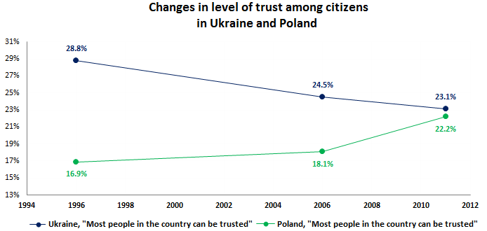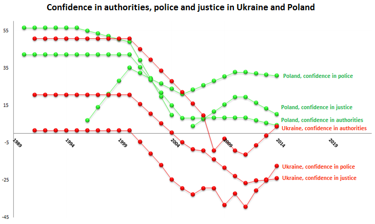 During Ukrainian post-Soviet period the citizens’ confidence in authority, police, and justice has dramatically declined. This was often observed in other post-Soviet countries, although, to a lesser extent. For example Poland: although trust in its institutions kept decreasing, the percentage of trusting citizens was always higher than that of the distrusting ones. In Ukraine, a more dramatic picture was observed: since the mid-2000s, the number of citizens distrusting the above-mentioned institutions has almost always been higher than the share of those trusting.