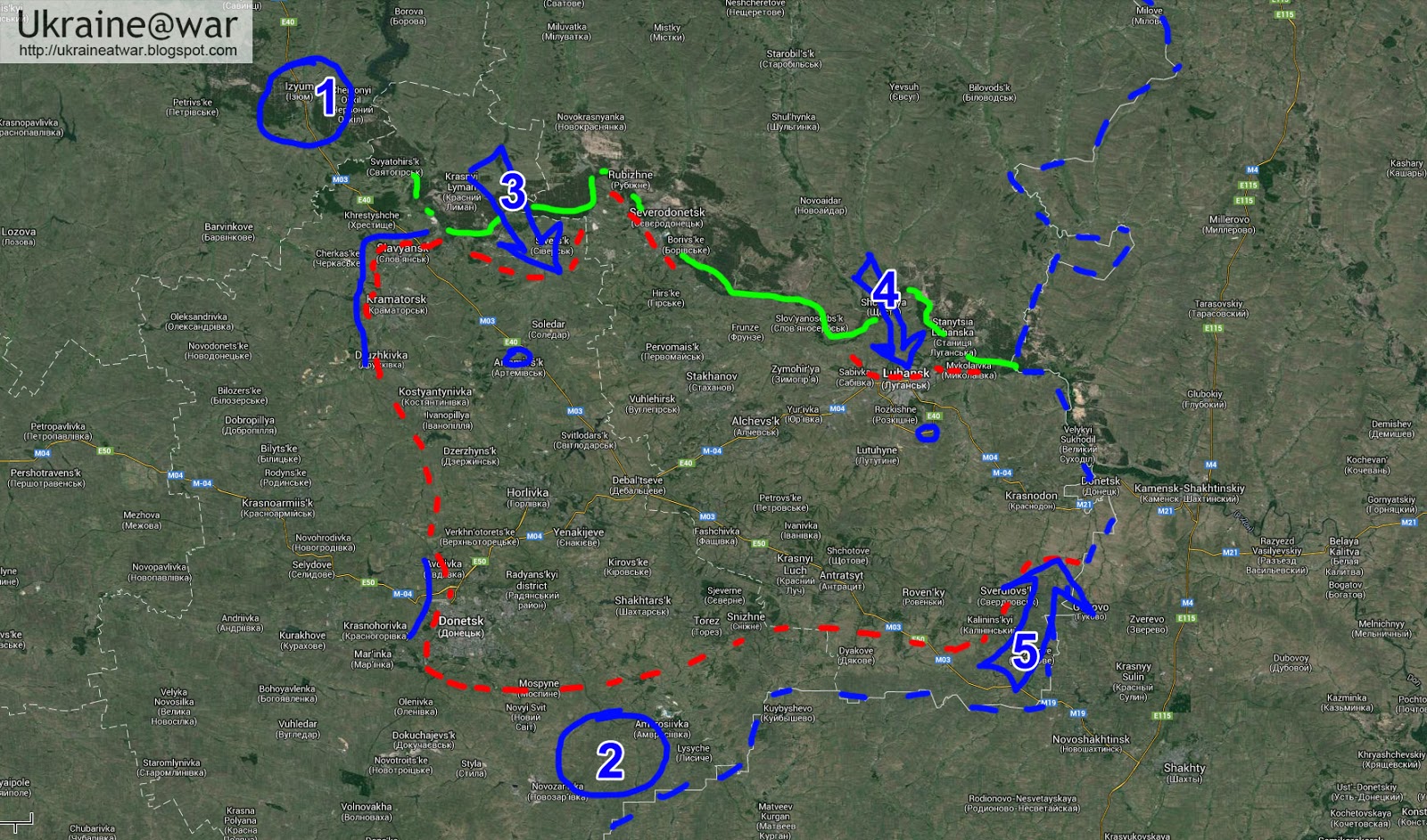 Blue dotted line = border with Russia; Green