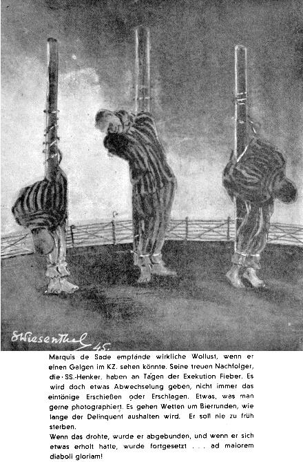 The Gallows The Marquis de Sade would have been in ecstasy if he could have seen the gallows in a KZ [concentration camp]. His faithful successors the SS-hangmen had daily execution fever. It provided some variety, beyond the eternal, monotonous shootings and beatings. Something one could photograph with pleasure. They placed bets for rounds of beer on how long the offender could hold out. He must not die too quickly. When he threatened that, he was bound, and when he had somewhat recovered, it continued ... to the greater glory of the devil! |