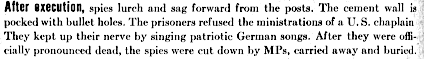 Enclosed you will find a photocopy of three photographs from LIFE magazine (June 11, 1945, p. 50) which appear at the end of a photo essay titled "FIRING SQUAD: Army executes three German spies who were caught in U.S. uniforms." The story appears on three pages � 47, 48, and 50. There are a total of nine, mutually-consistent photographs in the essay. The first paragraph of the story is:
