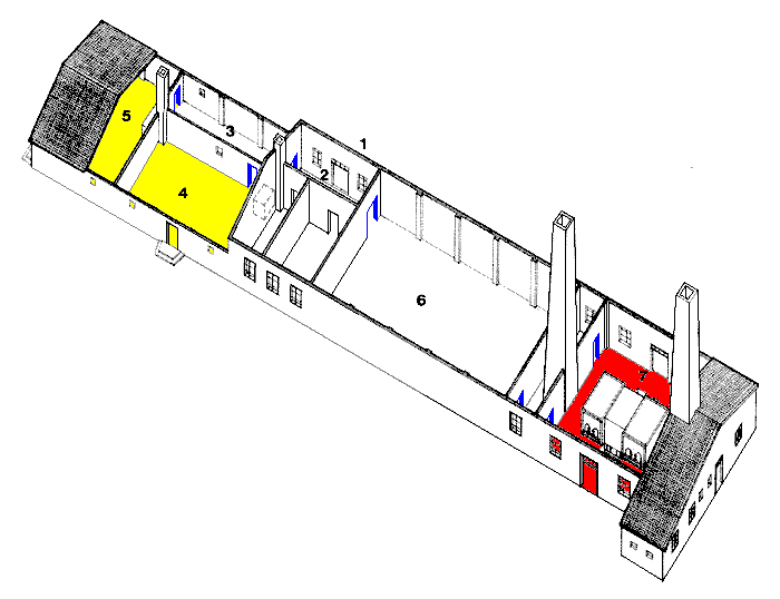 Crematorium IV. Drawing by Kate Mullin. The functional arrangement is simple and straightforward. The entrance on the north side 1 leads to a vestibule 2 and a corridor 3 to two gas chambers 4 and 5 equipped with stoves to preheat the room during the winter. Between the vestibule and the incineration room is a large morgue 6, which was also used as an undressing room in the winter. The center of the incineration room is occupied by a double-four-muffle furnace 7, connected to two chimneys. N.B.: This is an axonometric drawing; the three-dimensional effect is derived from the exact measurements and angles of the original plan. See plate 18. |