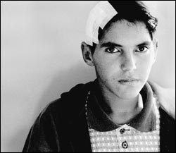 Mahmoud Al Medhoun, 15, was hit three times—in the leg, back, and abdomen—by soldiers firing from the hatch of a tank. One bullet lodged in his spine, smashing three vertebrae and pinching a nerve. His right leg is paralyzed. Doctors have removed part of his colon and repaired his liver; he is unable to eat. "God willing, I will walk again," declares Mahmoud. But when his father cites the doctors' opinion that the paralysis is probably permanent, the boy rolls himself into a ball, burying his face in the crook of his arm and crying.