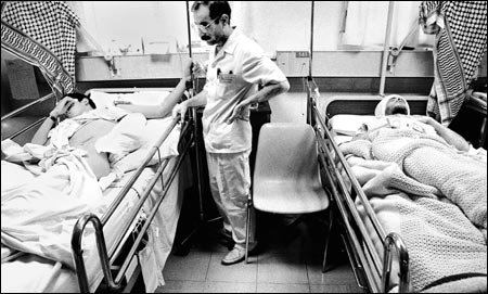 Dr. Hanania says he is not so worried about the hundreds of patients his staff is contending with now. "The problem is what will be coming to the center in the coming days," he says. Because the Israelis are limiting freedom of movement between West Bank towns and villages, the doctor says, it's impossible to estimate how many young men will need rehabilitative care. But when the roads open, Dr. Hanania expects a flood. "There are reports that there are 25 to 30 percent of the injured in need of rehabilitative care"—several thousand people, given the current casualty figures. "If that's true, it's a national disaster."