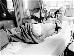 Across the Jordan River in Amman, Dr. Khoury pulls back Fouad Mahed's bedcovers to reveal a bandaged stump—the remnants of his right leg. After he was hit, doctors in Gaza pumped 17 pints of blood into Mahed, to replace that which was pouring from the wound. Complications from a skin graft forced doctors to send him to Amman, where he could get treatment unavailable in the Gaza hospitals.