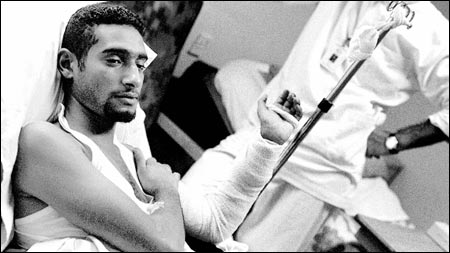 Isa Abu Abdullah, 19, was confronted by Israeli tanks in Gaza on the third morning of Ramadan, November 29. He threw stones, then was hit by a bullet in the left calf. While down, he was hit by six more bullets: three in his left thigh, two in his right thigh, and one in his right arm. Doctors at the Shifa Hospital in Gaza moved part of an artery from his right leg to his left, then sent him to Amman for further surgery.