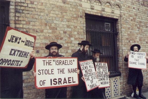 ![]() American Orthodox-Jews led by Rabbi Moshe Ber Beck in a miniature demonstration at Central Park, New York. The demonstration took place whilst many Jews were unfortunately celebrating a day which they call Yom Ha'atzma'ut � that sad day in the Jewish calendar when Jews accepted Palestine and took jurisdiction over it. Photo and caption originally, but no longer, on the Naturei Karta web site at www.geocities.com/Pentagon/Bunker/5750/orthodox.html |
