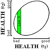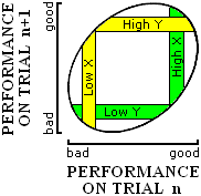 Display 12-2. Plausible relation between first and second test � within each class, a positive but less than perfect correlation, and with no change in mean or standard deviation. Matching on any one test can be seen to be accompanied by undermatching on the other.