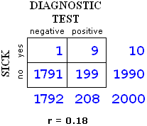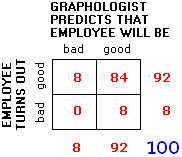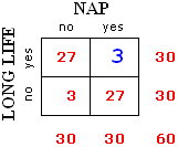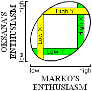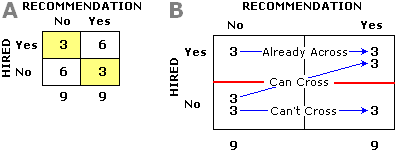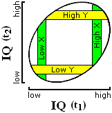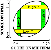 Three final details. First, as the magnitude of the correlation increases, the yellow regions in Display 12-6 expand, and so the probability of finding regression-incompatibility grows. Second, when the correlation is negative, the regression-incompatible yellow angles are shifted to the lower-left and upper-right. This can be readily demonstrated by constructing a figure like Display 12-6, but containing a negative correlation (assume the physics professor matched his students not on aptitude but on alcohol consumption). And third, when we are given not the complete data as in Displays 12-5A or 12-5B, but only the summary statements that appear underneath them, then we are only able to identify regression-incompatibility if we also know the sign of the correlation between X and Y. Thus, if the physics professor had matched on age, then summary statements of the sort under Display 12-5A by themselves would be ambiguous � only by learning also that the correlation between age and grade was positive would we be able to conclude that the results were regression-compatible, or that it was negative and that the results were regression-incompatible.
