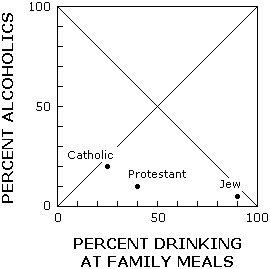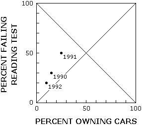 The difficulty of inferring a cause-effect relation from correlational data is summed up in the aphorism Correlation does not imply causality. If X goes with Y, we are safe to assume that X and Y are tied together in some sort of causal pattern, but we cannot tell which of many alternative causal patterns it might be. The chief possibilities are as shown in Display 11-1. When confronted with a correlation between X and Y, we would benefit from running through the list of possible causal chains. The benefit would not be any high probability of hitting on the right interpretation � there are too many variables that can serve the role of third variable (Z), and too many causal patterns more complex than the ones shown in Display 11-1 that we would have omitted to consider. Rather, the benefit would be the humbling recognition of several interpretations at least as appealing as the one that first struck us with such conviction. Here are a few examples.