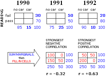The correlation that we have been working with in Displays 1-2 and 1-3 is not the only one that is compatible with the distribution requirements for fathers as well as for sons laid down in Display 1-1. Display 1-4 repeats the correlation shown in Displays 1-2 and 1-3, but also shows four new correlations. But let us begin my locating in the monster graph below the two graphs with which we have been familiarizing ourselves above.