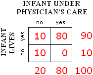 If we did not know the IQ of this 28th father, the best we could do would be to predict that his son would have the mean IQ of sons in general, which is to say all the sons that we had ever measured � and that grand mean is 12. But if we tested this 28th father and found that his IQ was 10, we would change our prediction for this son to the mean IQ of all the sons whose fathers had scored 10 in the past. How many sons can we find, all of whose fathers scored 10 in the past? We can find three such sons, represented by points A-C. What was the mean IQ of these three sons? Son A had 12, B had 11, and C had 10; the mean IQ is (12+11+10)/3 = 11. We would predict, then, that the new father whose IQ is 10 will have a son whose IQ is 11.