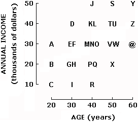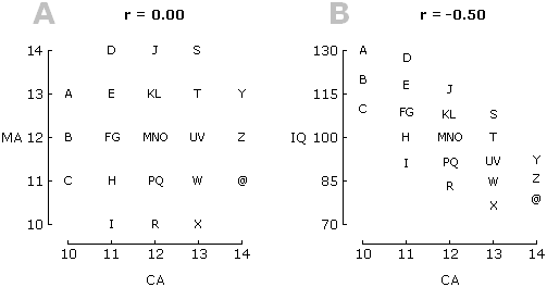 To continue, we note that Display 1-2A contains the 26 letters of the alphabet along with the @ symbol. Each of these 27 symbols provides two pieces of information about each of the 27 father-son pairs � the IQ of the father, and the IQ of his son. Take point A, for example. By looking below it, we see on the X axis that the father scored 10, and by looking to the left of it, we see on the Y axis that his son scored 12. Or, in the case of point U, we see that the father scored 13 and his son also scored 13.