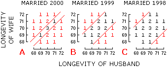 As it happens, each of these fathers had a single son, and the same IQ test was administered to each of the sons. As can be seen in red below, the son scores happened to distribute themselves in exactly the same way as the father scores � that is, three sons go 10, six got 11, and so on.