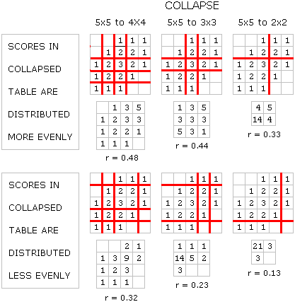 Our old Display 1-2 above can be found in Display 1-4B below. What is new is that instead of representing each father-son pair with a capital letter or an @, we now use a number to specify how many father-son pairs fall in each position in the graph. For example, points A, B, and C in Display 1-2A are now each represented by a 1 in Display 1-4B, points E and F are represented by a single 2, and points M, N, and O by a single 3. The blue arrows just above the X axis mark the five possible predictors � the Xtors � and the blue arrows just to the right of the Y axis mark the corresponding five possible Yteds.