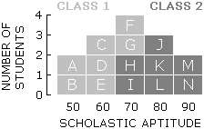 Display 12-1. Frequency distribution showing that at the beginning of the school year, the seven students in Class 1 (light green blocks A to G) tended to have lower aptitude test scores than the seven students in Class 2 (dark green blocks H to N). That Class 1 students F and G had the same aptitude score as Class 2 students H and I is relied upon in the defective procedure known as "matching in order to overcome initial group differences.".