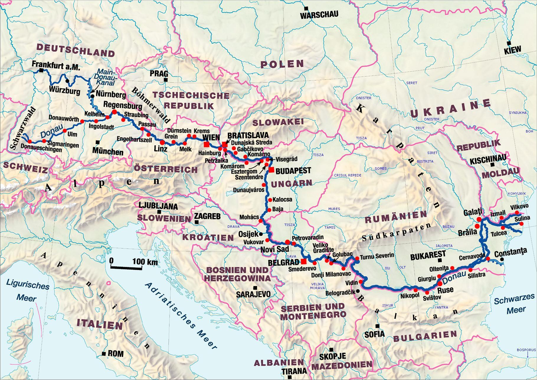 Blue-font names of rivers have been added to the original. The course of the Tisza from its origin in Ukraine to its being shared with Romania, reentering Ukraine, leaving Ukraine in favor of Hungary, briefly making a farewell contact with Ukraine, touching Slovakia, flowing all the way through Hungary, and ultimately joining the Danube in Serbia is readily appreciated here.