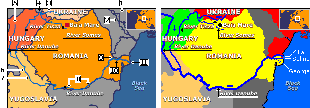 By way of demonstrating how badly BBC coverage of Danube events can deteriorate, it might be noted that in the BBC map covering the Baia Mare spill on the upper-left above, Ukraine is written off as untouched by the toxins first near the point of origin and again at the mouth of the Danube. The following eleven BBC errors contribute not only to this false impression, but also to the reader's general confusion: