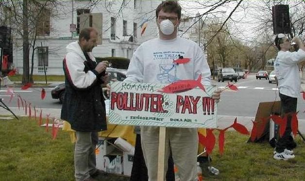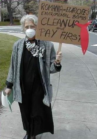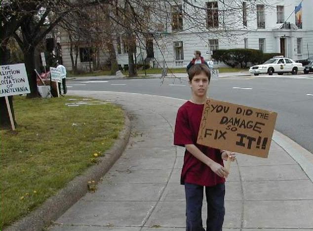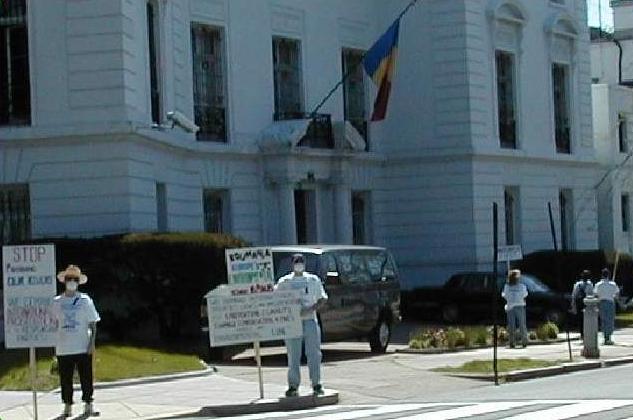 Photographs of a 1-2 April 2000 demonstration in front of the Romanian Embassy at 1607 23rd St, NW, Washington DC 20008. In each photograph, a placard can be seen pointing an accusing finger at Romania (sometimes spelled Roumania).
