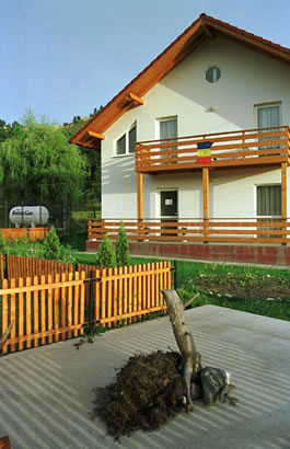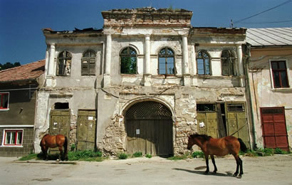 Die umstrittene kanadische Bergbaufirma "Gabriel Resources" verspricht der Bevölkerung eine Umsiedlung in moderne Fertighäuser (am Balkon die rumänische Flagge) |