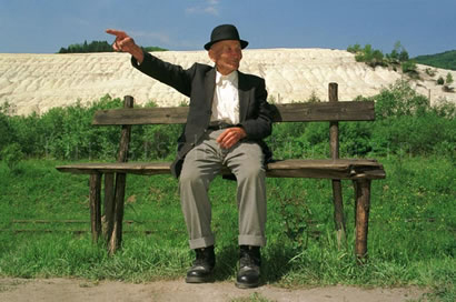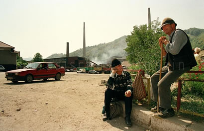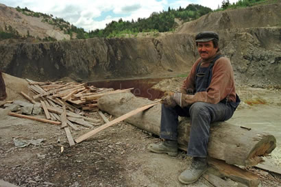 Alter Mann vor Abraumhalde der Trennanlage des Gold-Tagebaus von Rosia Montana |