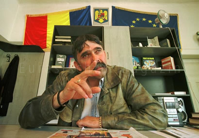 Bürgermeister Virgil Nartisa von der postkommunistischen PSD am Amtstisch mit Flaggen |