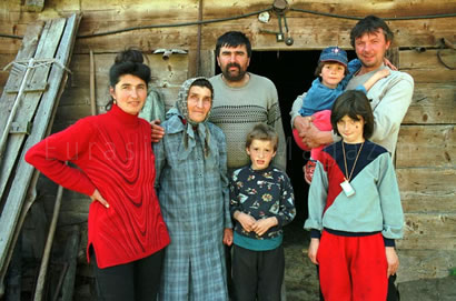 Eugen David (rechts), Vorsitzender der oppositionellen NGO "Alburnus Major", mit Großfamilie vor einem Stall seines Hofes im Rosia-Tal, das fast komplett abgetragen werden soll |