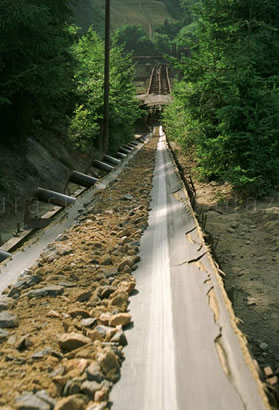 Das Erz aus der alten staatlichen Goldmine bei Rosia Montana läuft auf Foerderbändern in die verrottete Bearbeitungsanlage im Tal. |