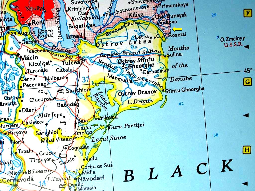 Detail from map of Romania in National Geographic Atlas of the World, Sixth Edition, 1990, p. 65. George channel still meanders. Moldova has been painted red here, and a yellow arrow added to mark the location of the Bystre Channel.
