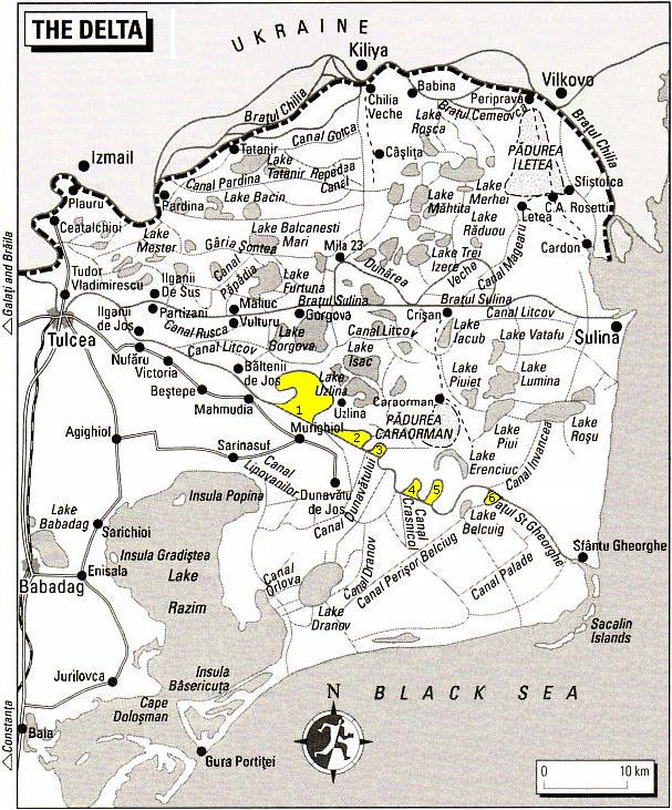 Romanian Danube Delta showing George Channel straightened by six shortcut trenches bypassing six meanders. Numbering and yellow highlighting of each bypassed meander has been added. Originally at