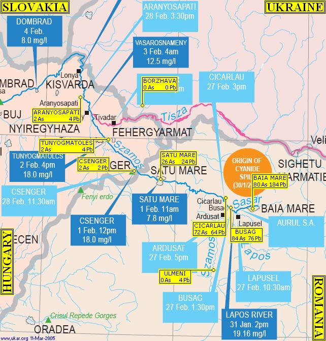 Some of the tabular data has been superimposed below on a detail from a 300X enlargement of MAP: TRACKING TWO SPILLS (which tracked pollution from the 30-Jan-2000 Baia Mare and the 10-Mar-2000 Baia Borsa spills). The seeming complexity of the map vanishes when it is recognized that the original map was adapted here merely because it happened to already locate seven of the nine sampling sites mentioned in the table, and that little more needs to be attended to for present purposes than the contents of the yellow boxes which show the observed Arsenic (As) and Lead (Pb) concentrations as multiples of the European Commission standard of 0.005 mg/L. For example, "80 As" in the yellow Baia Mare box below means that the observed level of 0.40 mg/L evident in the table above is 80 times the European Commission standard of 0.005 mg/L. Presentation of such multiples serves to underline that although the three Hungarian measurements, and the one Romanian measurement at Ulmeni, may have seemed low and harmless when expressed in mg/L, when expressed as a ratio of the European Commission standard, are revealed as being high and dangerous, though of course nothing in comparison with the worst of the Romanian waters.