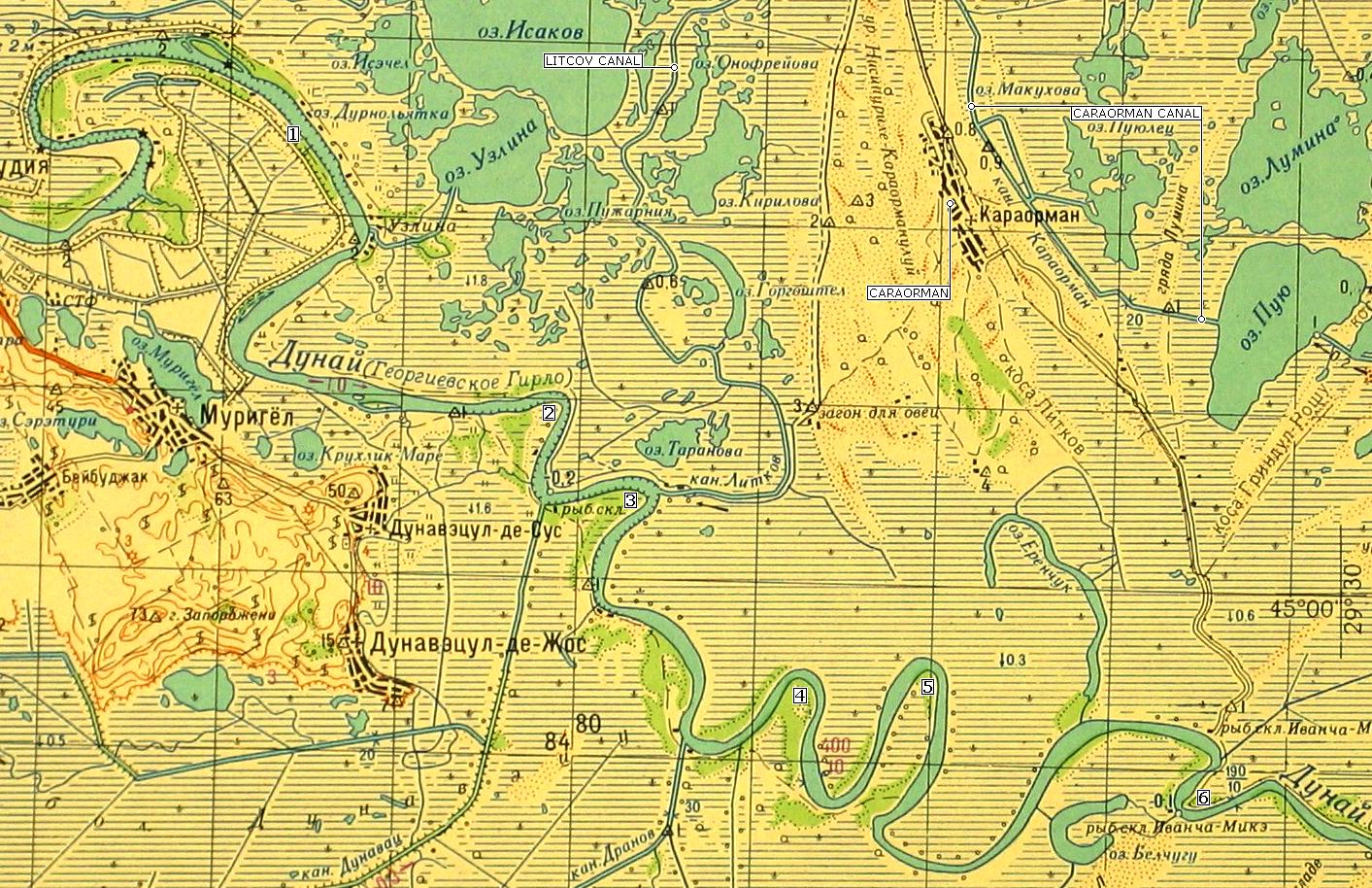 Detail from Soviet map of Romania's Tulcea district, L-35-XXX, published in 1983; six numbers in boxes added.