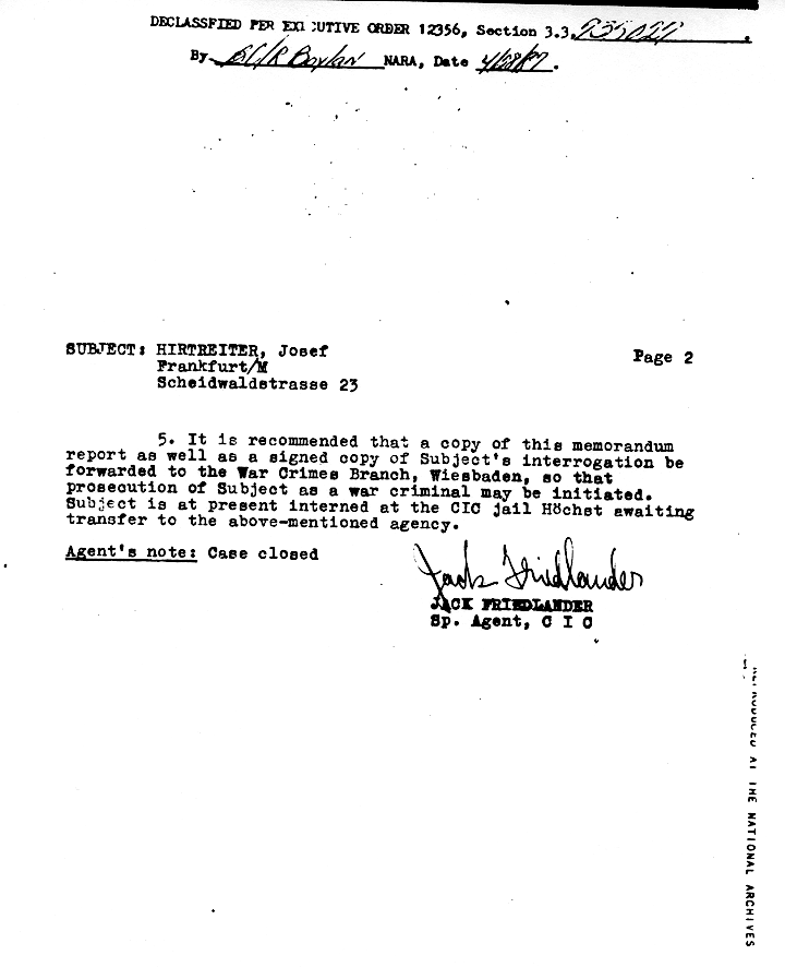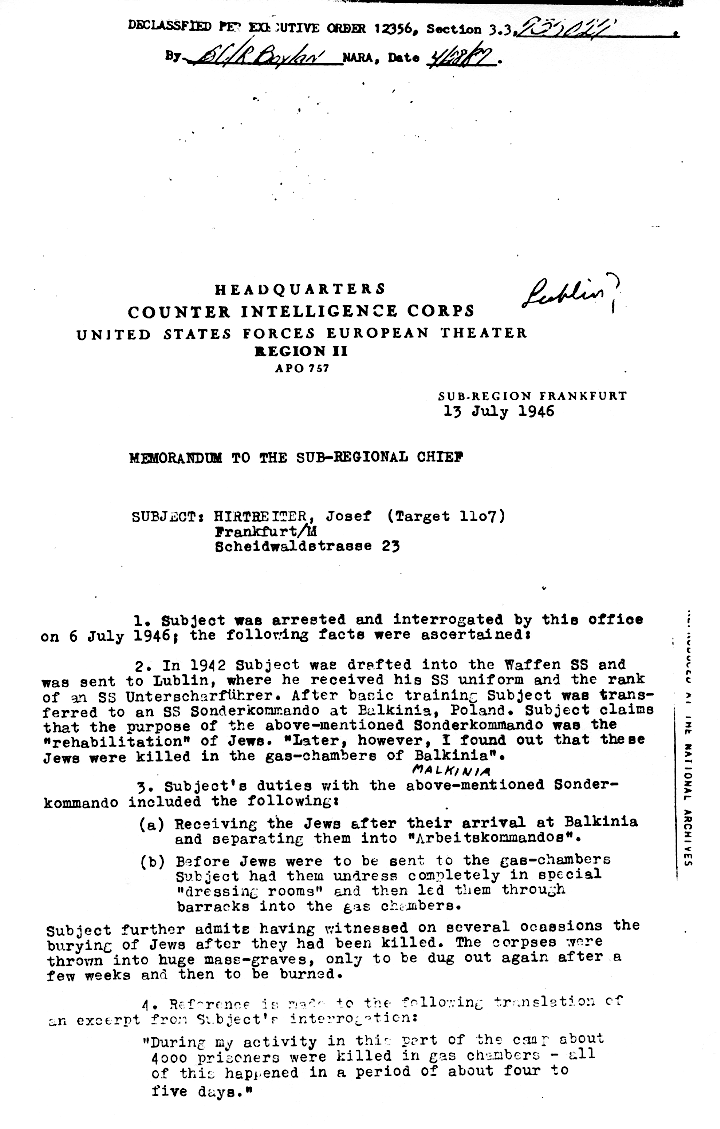 In the Counter Intelligence Corps (CIC) document reproduced below, SS-Unterscharführer Josef HIRTREITER is said to confess to working with an SS Sonderkommando at Malkinia, Poland, there leading Jews into gas chambers, witnessing the burial of bodies in mass graves, and witnessing bodies being disinterred and burned. Malkinia, as the CIC appears to learn from HIRTREITER, was a death camp of major significance, as one period of four or five days saw the gassing of 4,000 Jews. This Counter Intelligence Corps document is not easy to dismiss as a fabrication, as it comes with identifying notation which facilitates verification.