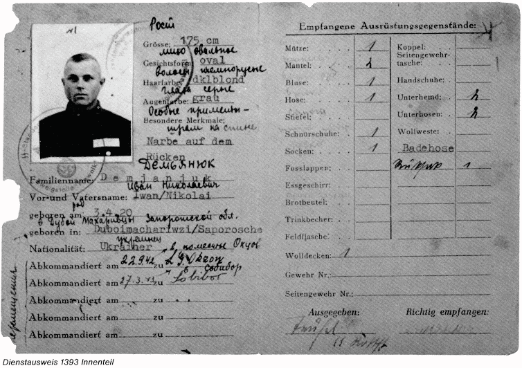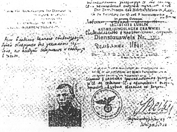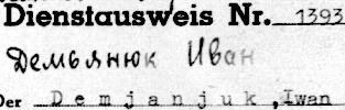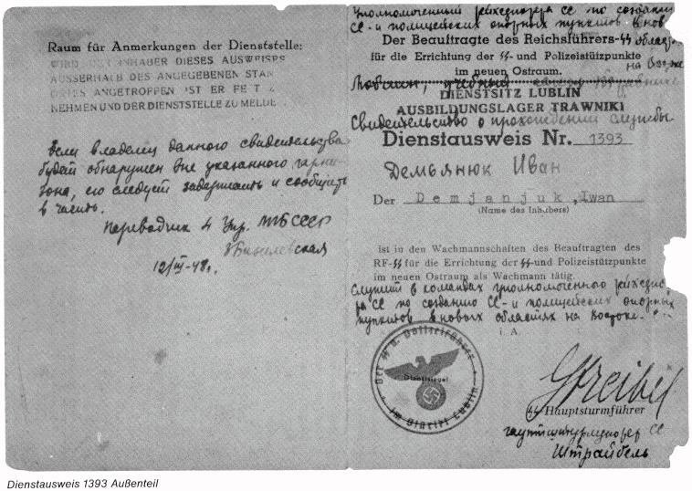 For the Establishment of SS and Police Bases In the New Eastern Territory SERVICE ASSIGNMENT LUBLIN TRAINING CAMP TRAWNIKI IDENTIFICATION CARD NO. 1393 The Demjanjuk, Ivan (Name of Bearer) is employed as a guard in the Guard Units of the Reich Leader of the SS for the Establishment of SS and Police Bases in the New Eastern Territory. |