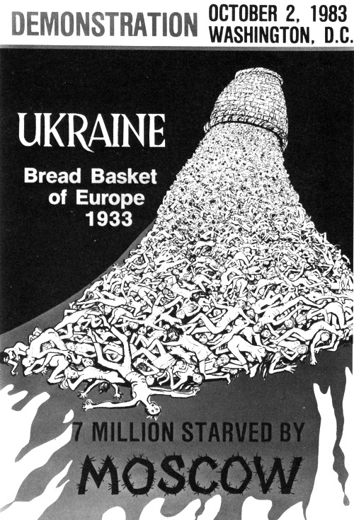 ![]() Poster, designed by Roxolana Luchakowsky-Armstrong. An estimated 15,000 Ukrainian Americans turned out for the rally, and several thousand of them carried copies of this poster on the march to the Soviet Embassy. In Famine in the Soviet Ukraine 1932-1933: A memorial exhibition, Widener Library, Harvard University, Harvard University Press, Cambridge, Massachusetts, 1986, p. 61. |