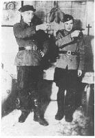 ![]() 02-Jun-1950 Question: You are presented with one more photograph showing two men in German military uniforms. One of them is holding a pistol in his hand. On the back of the photograph is the inscription: "Memento for my dear son, Kolya. I5.II.43" Who are the people appearing in this photograph? Answer: I am shown in this photograph holding the pistol in my hand. Together with me is photographed one of my acquaintances. I do not remember his surname or first name, or place of residence. We were photographed together in the Trawniki camp, when we were studying in the sentry school. I sent this photograph also to my wife in Kamianets-Podilsky oblast. I5.II.43 could mean 15.11.43, which would be 15-Nov-1943; or it could mean 15.II.43, which would be 15-Feb-1943. As the correspondence is between Americans, 6-2-50 likely refers to 02-Jun-1950. For "sentry," Tkachuk uses a Russian derivative of the German "Wachmann." Red emphasis added. |