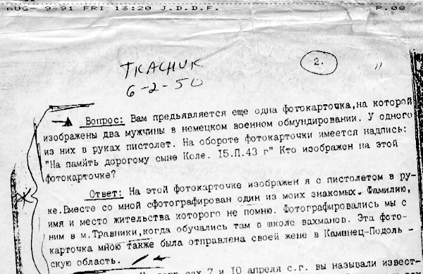 INTERROGATION REPORT 9 March 1961, City of Vinnitsa TKACHUK Ivan Kondratyevich .... In photograph no 3 I am depicted with the machinist of the gas chambers ('dushehubka') of the Treblinka death camp, Ivan Marchenko... NO 85-3435, In the United States Court of Appeals for the Sixth Circuit, John Demjanjuk v. Joseph Petrovsky, et al., Petitioner's Appendix Volume One, p. 00084. Errors and irregularities were in the original, as was parenthesized material, as were ellipses. Red emphasis added. |