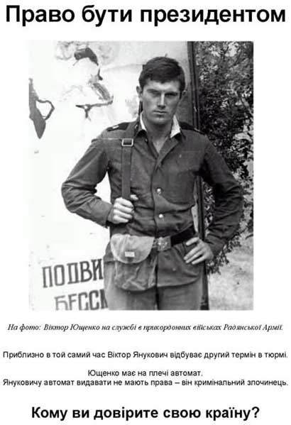 In the photo: Viktor Yushchenko serving in the border forces of the Soviet Army. At approximately the same time, Viktor Yanukovych was serving his second prison sentence. Yushchenko slings an automatic rifle over his shoulder. Yanukovych is not permitted to carry a firearm � he is a convicted criminal. To whom will you entrust your country? |