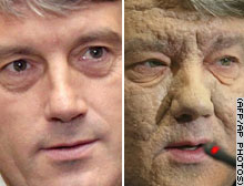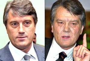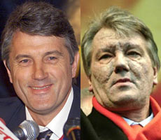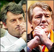 ![]() Yushchenko before and after: smooth-faced only five months ago and pock-marked by the effects of poison (AP) |