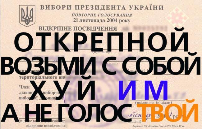 ![]() The document shown is the absentee certificate which permits a voter to obtain an absentee ballot at any polling station. When the above certificate is given to a voter who anticipates casting a vote in a precinct in which he is not registered, his name is supposed to be removed from the list where he is registered. When a traveller casts an absentee ballot in a precinct in which he is not registered, he is required to show his passport along with the absentee certificate. One method of falsification is to have corrupt officials fail to confiscate the certificate upon its being used, which permits it to be used again in another district. Another method is to have someone other than the person named on the certificate cast the vote, either by that person also having acquired possession of the named person's passport and corrupt officials overlooking the discrepancy between the passport photo and its presenter, or by even more corrupt officials not demanding passport identification. Vast numbers of such certificates are printed, and the monitoring of their use is perfunctory. The large-font overprint is pro-Yushchenko publicity in Russian advising to not give the certificate to anyone else, and to screw "them" (blue "them" indicating the Yanukovych side), and to not give up "your" vote (orange "your" indicating the Yushchenko side). |