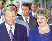 ![]() Bodyguard Mykola Melnychenko (center) with President Leonid Kuchma (left) and Health Minister Raissa Bohatyriova (right), September 1999. |