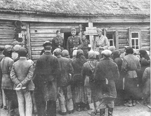 A crowd of Ukrainian civilians gathers to listen to directives from the occupying German forces during the Second World War.